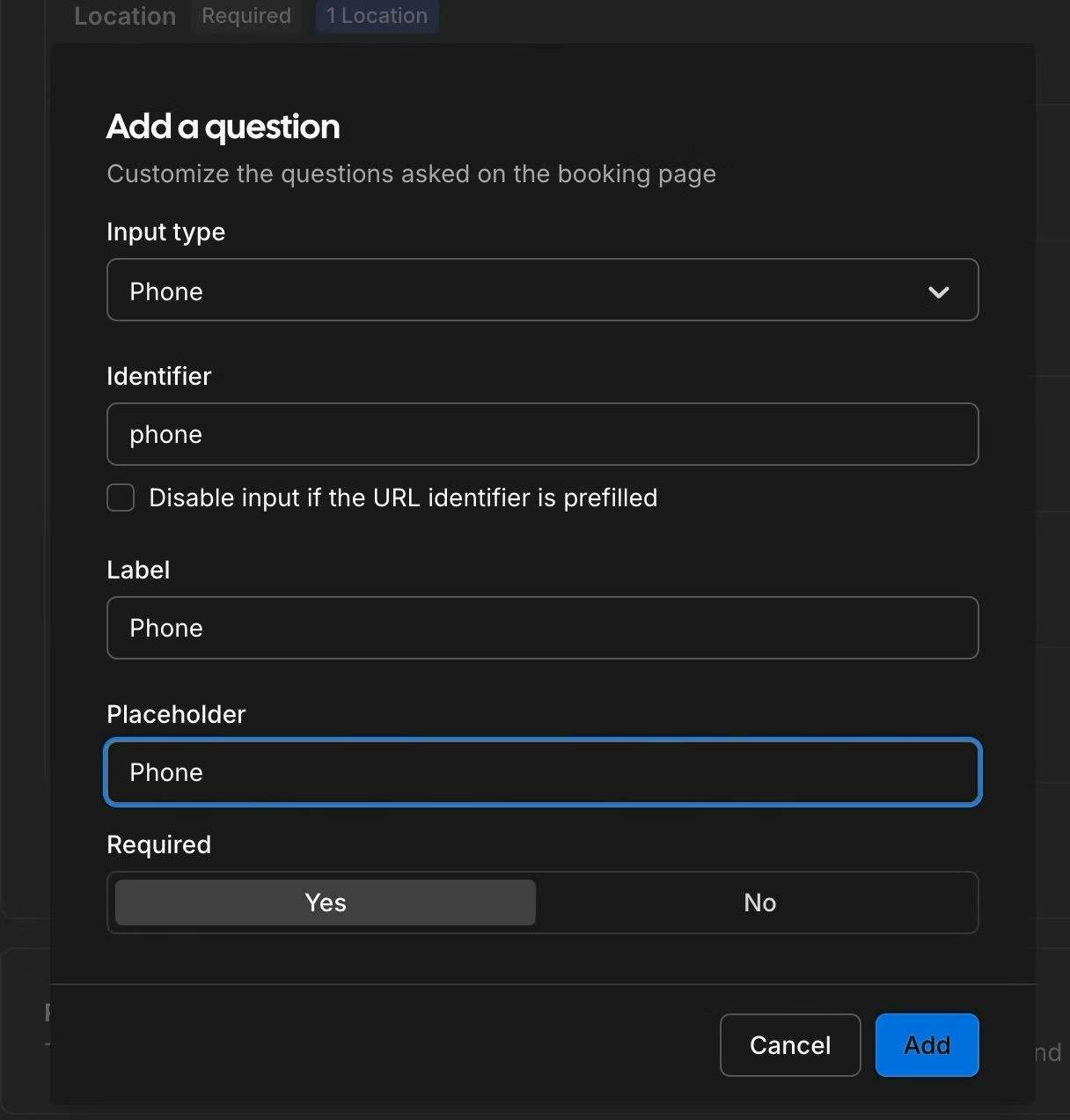 - Phone field setup: Add phone field in Cal.com event settings with identifier “phone”. See Phone Number in Calendar Events for detailed setup.