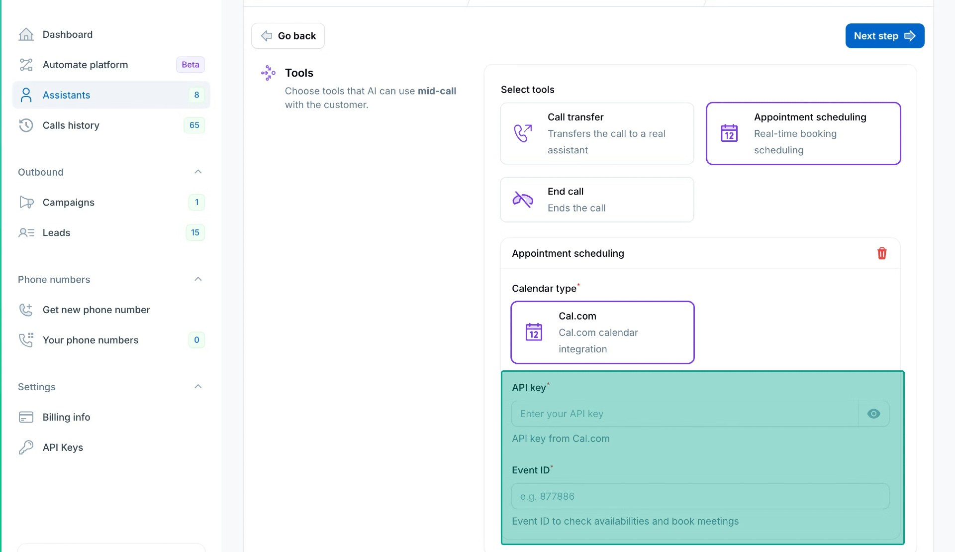- Steps: Go to assistant settings → Appointment Scheduling → Enter API key and event ID → Save